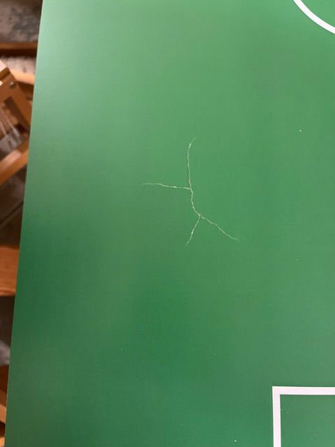 Mindre skada i spelplan, se bild. Kan slipas till eller byt ut skivan mot en mdf skiva etc. 50% rabatt.