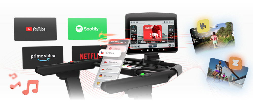 Vill du kombinera träning med underhållning? Med stöd för appar som Netflix, Prime Video och Spotify, kan du njuta av dina favoritfilmer och musik medan du tränar. Med sociala medier-appar som Facebook och Twitter är du alltid uppdaterad, även under träningspasset.