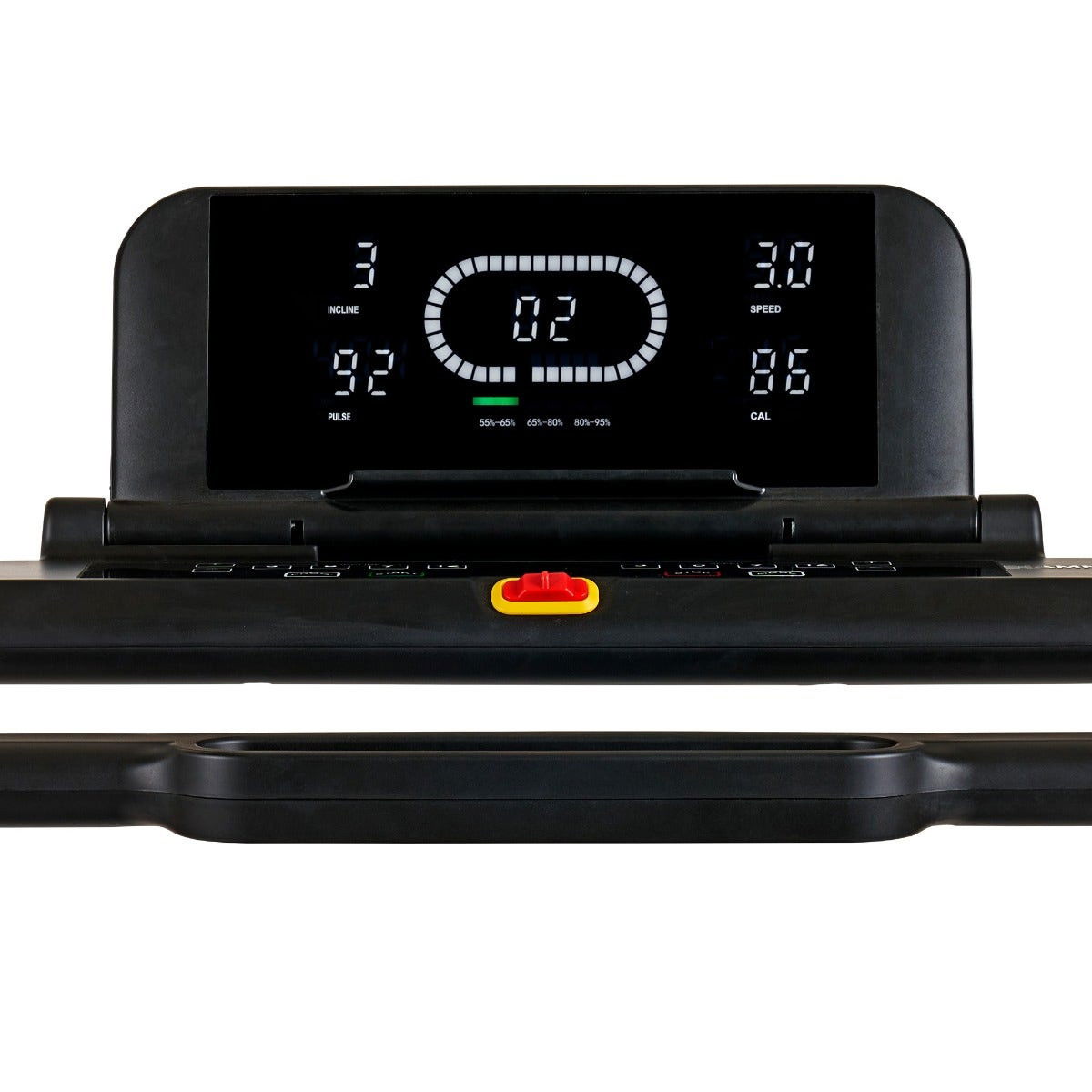 - Displayen i enheten visar tid, distans, hastighet, kaloriförbrukning, stigning, tid/400m och puls